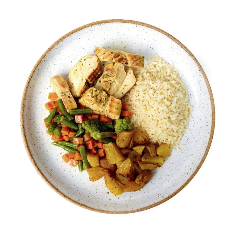 Frango grelhado ao molho de maracujá, arroz branco, batata sautée e mix de legumes