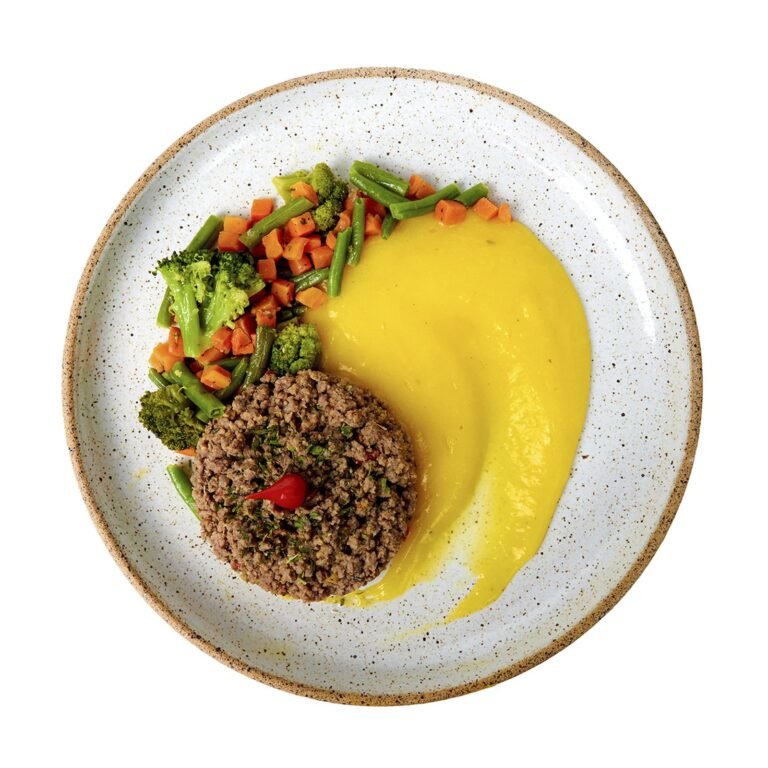 Carne moída (patinho), purê de mandioquinha e mix de legumes cozidos