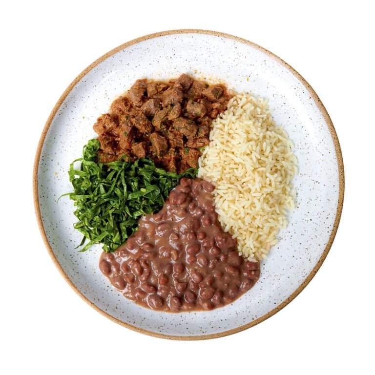 Picadinho, arroz branco, feijão carioca e couve